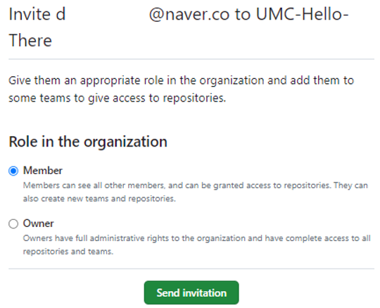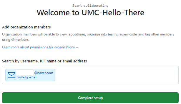 ④ 아래의 빈칸에는 초대하고자 하는 사람의 깃허브 이메일 또는 깃허브 아이디를 입력해주면 된다. 초대할 사람을 모두 입력했으면 Complete setup을 클릭한다.