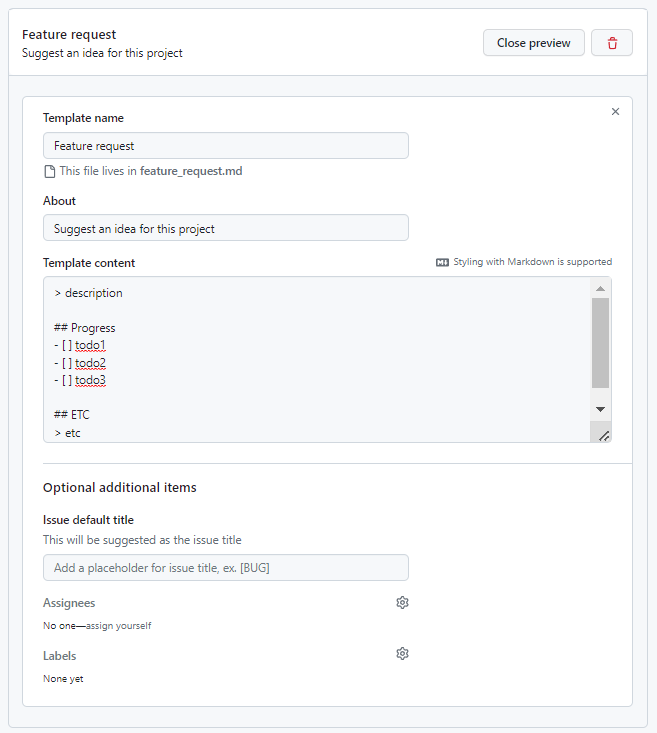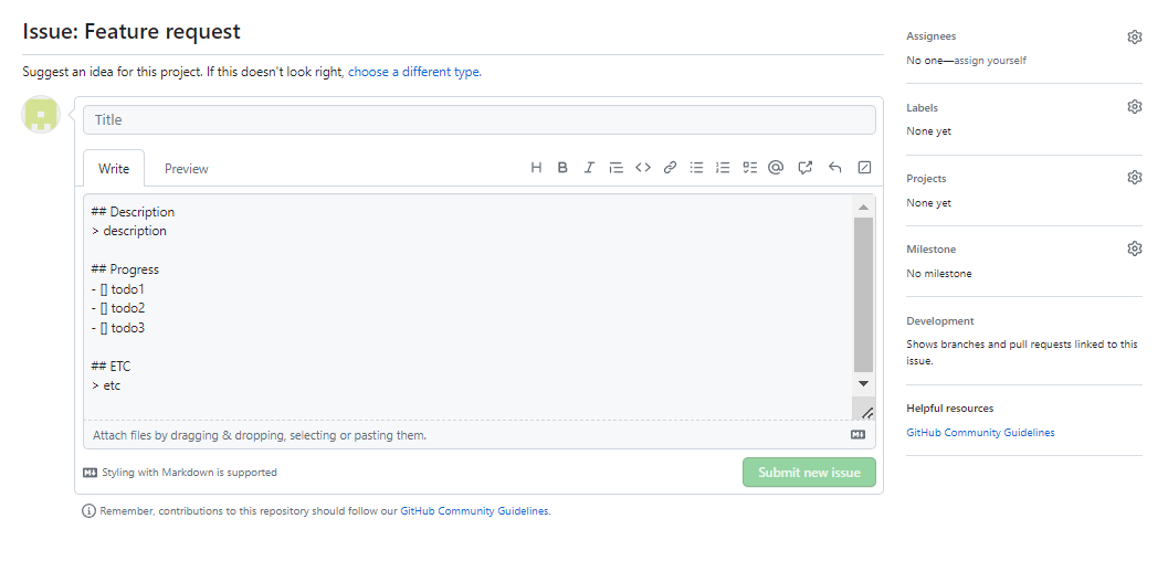 Issue를 작성할 때 작성방식을 통일화시켜주는 게 좋은데, 이 때 사용하는 것이 Issue 템플릿이다.