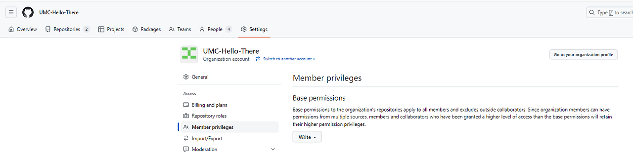 ⑦ 마지막으로, 본인의 Organization (Repository 아님)의 Settings > Access > Member privileges에서 멤버의 Base 권한을 Write로 설정해주어야 한다.