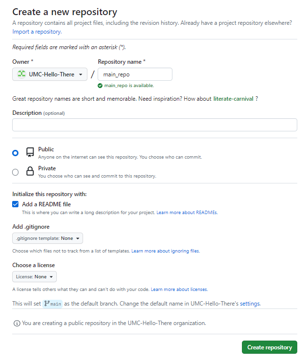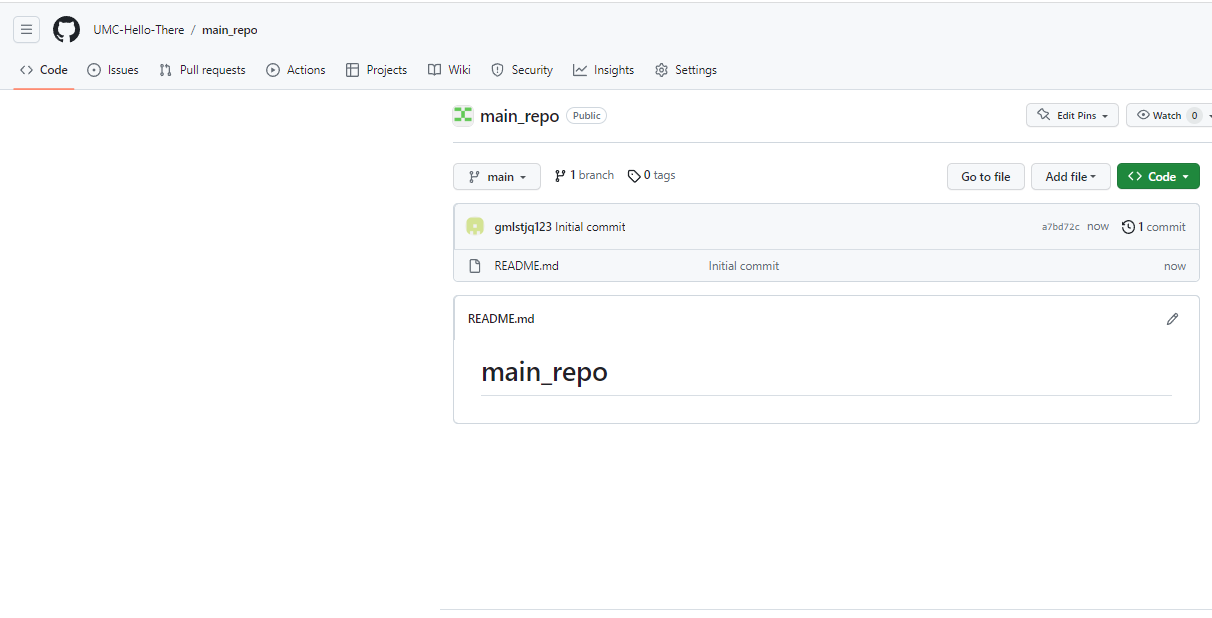 - Repository명은 임의로 지으면 되지만 일반적으로 main repo가 있어야 하므로 main이란 단어를 넣어준다.