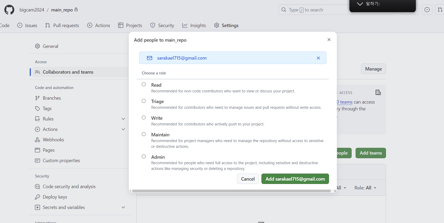 ⑧ 팀원을 추가하려면 Settings > Access > Collaborators and teams에서 팀원을 추가한다. 권한은 다음을 참조하여 부여한다. Repository roles for organizations