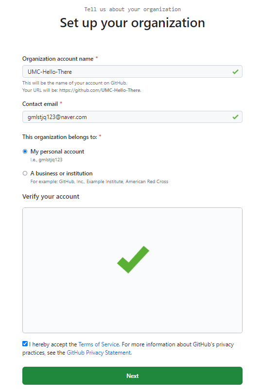 ③ 아래와 같이 본인의 Organization의 이름과 Contact email을 입력하고 Next를 누른다.