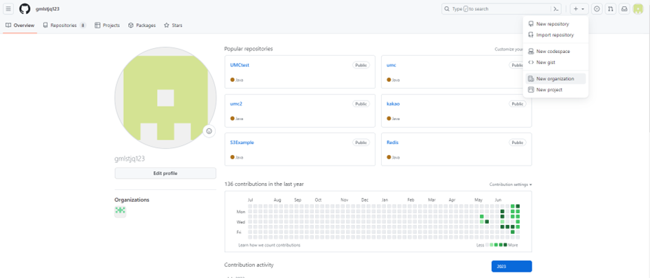 reference: https://velog.io/@gmlstjq123/Github-Organization-%EB%A7%8C%EB%93%A4%EA%B8%B0