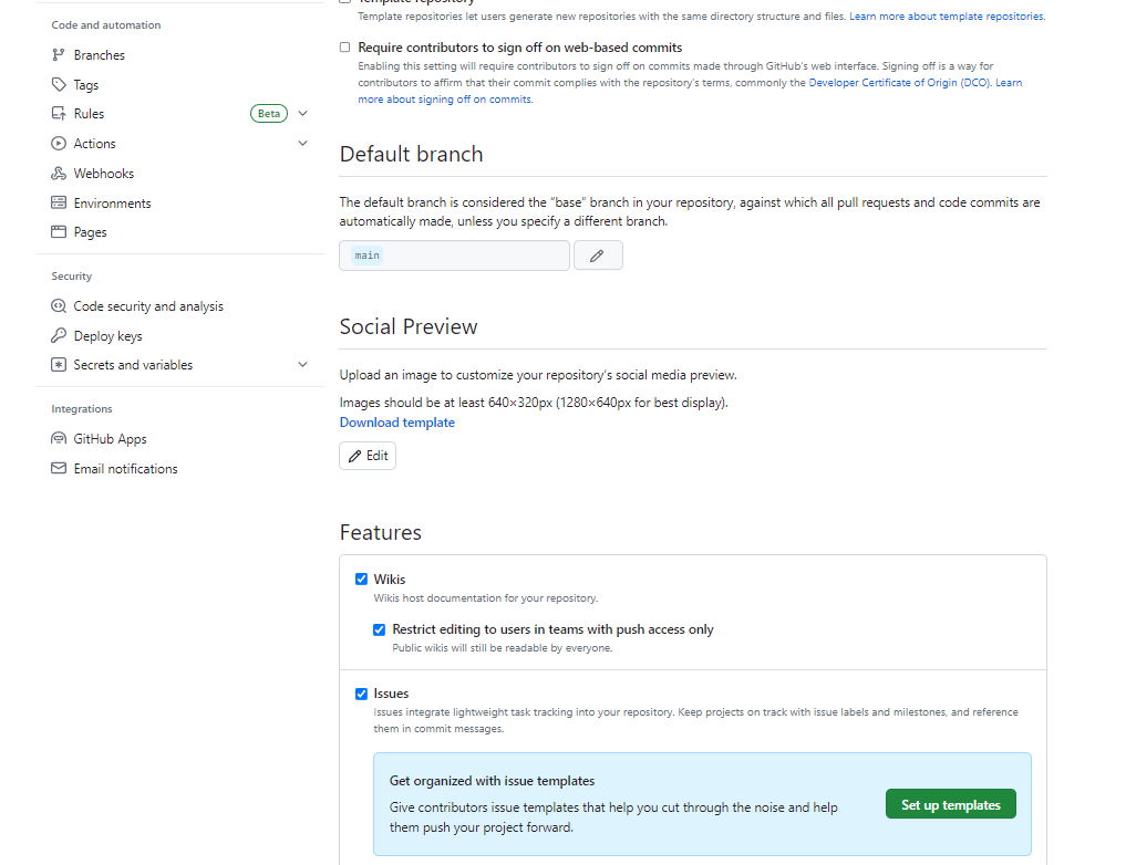 ① 방금 생성한 Repositiry의 Settings > General > Features > Issues > Set up templates를 클릭한다.
