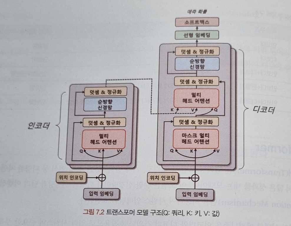 - 트랜스포머의 인코더와 디코더는 두 부분으로 구성돼 있으며, 각각 N개의 트랜스포머 블록으로 구성됩니다. 이 블록은 멀티 헤드 어텐션(Multi-Head Attention)과 순방향 신경망으로 이뤄져 있습니다. 멀티 헤드 어텐션은 입력 시퀀스에서 쿼리, 키, 값 벡터를 정의해 입력 시퀀스들의 관계를 셀프 어텐션(Self-Attention)하는 벡터 표현 방법입니다. 이 과정에서 쿼리와 각 키의 유사도를 계산하고, 해당 유사도를 가중치로 사용하여 값 벡터를 합산합니다. 이렇게 계산된 어텐션 행렬은 입력 시퀀스 각 단어의 임베딩 벡터를 데체합니다. 결국 입력 시퀀스의 단어 사이의 상호작용을 고려해 임베딩 벡터를 갱신합니다.