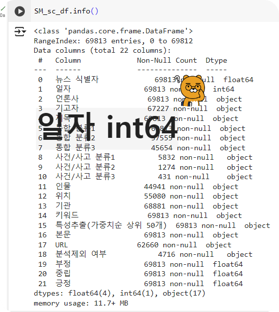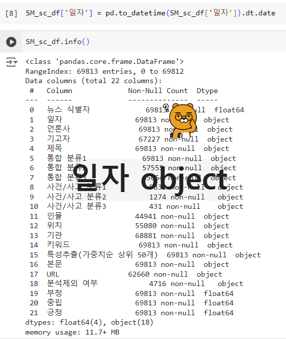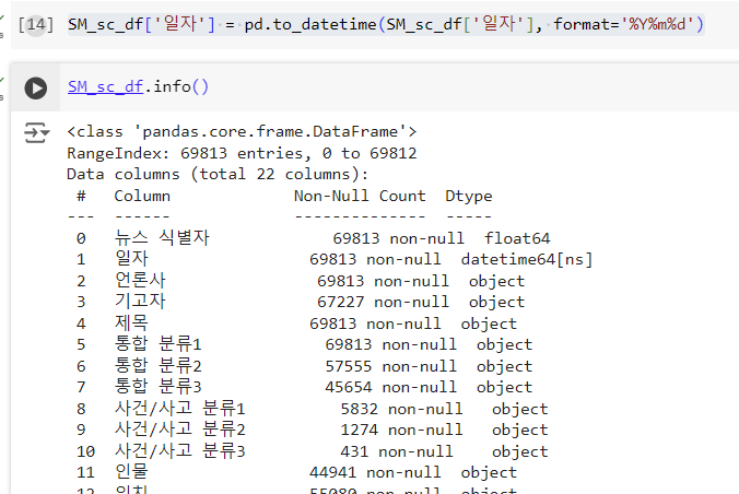 이렇게 날짜 컬럼이 object형이면 dataframe.info()해서 dtype을 확인하고 최종적으로 datetime형식으로 바꿔주도록 한다.